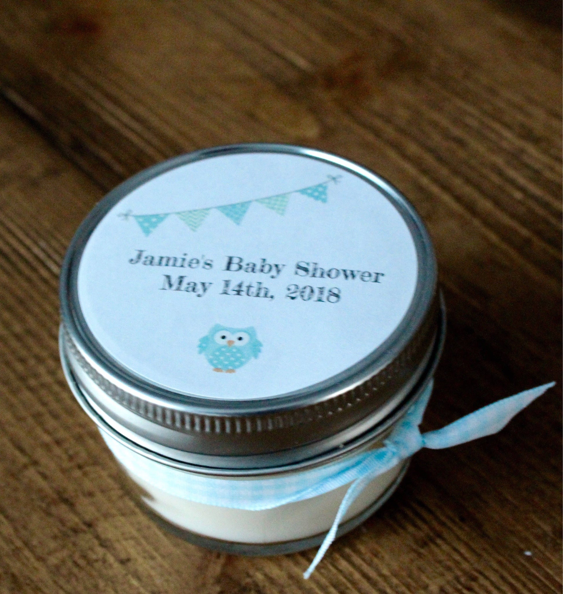 These adorable candle favors make a great memento of your baby shower. Each hand poured soy candle is made in small batches with premium soy clean burning soy wax and fragrance oils in a variety of scents that remind you of your sweet little one! The handsome 4oz glass jar with rustic metal top also includes a personalized label and is tied with baby blue gingham ribbon. Makes a great shower or wedding favor. Also makes a great small gift that a gift card could be added to.