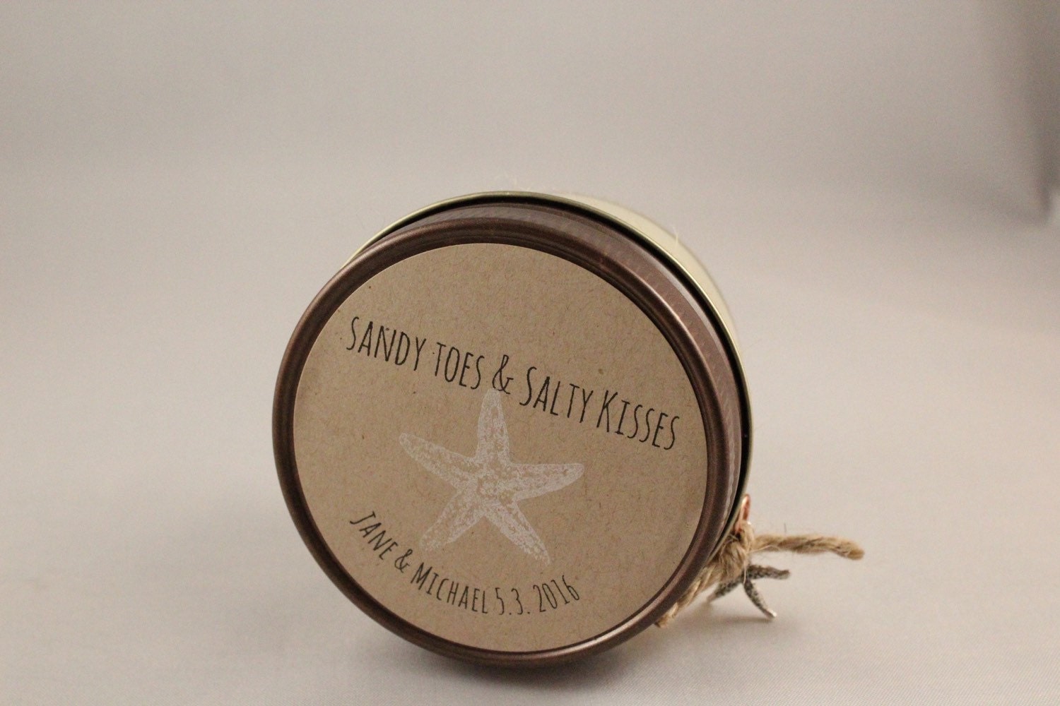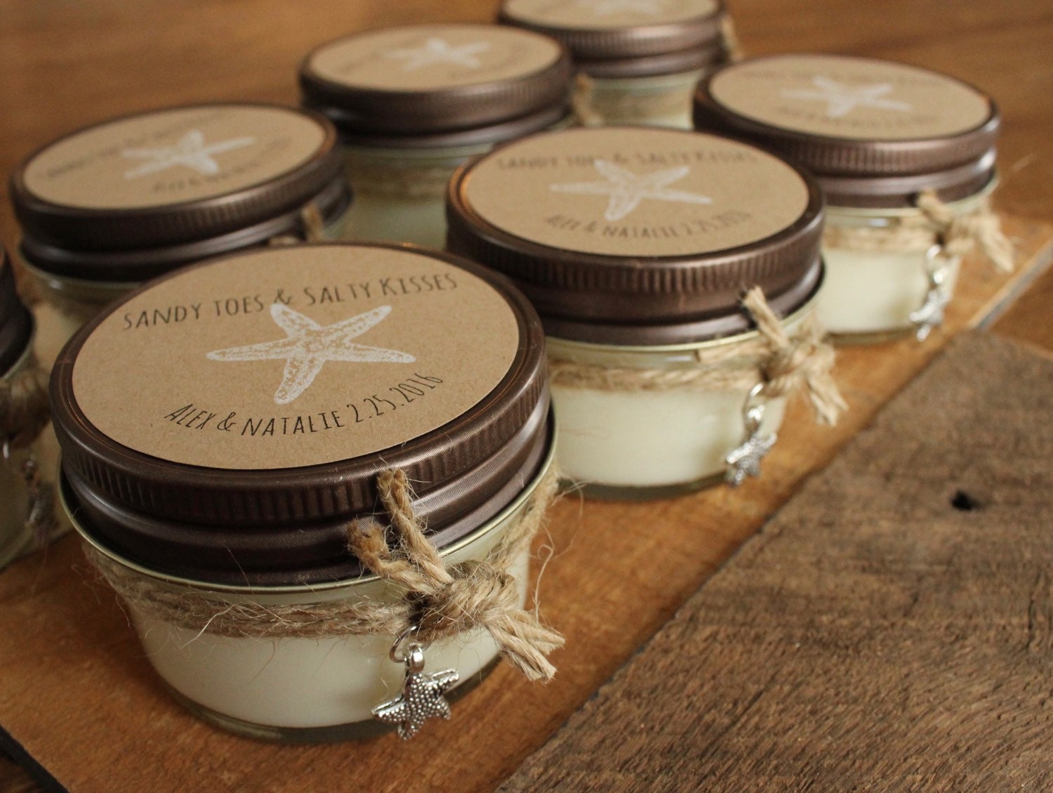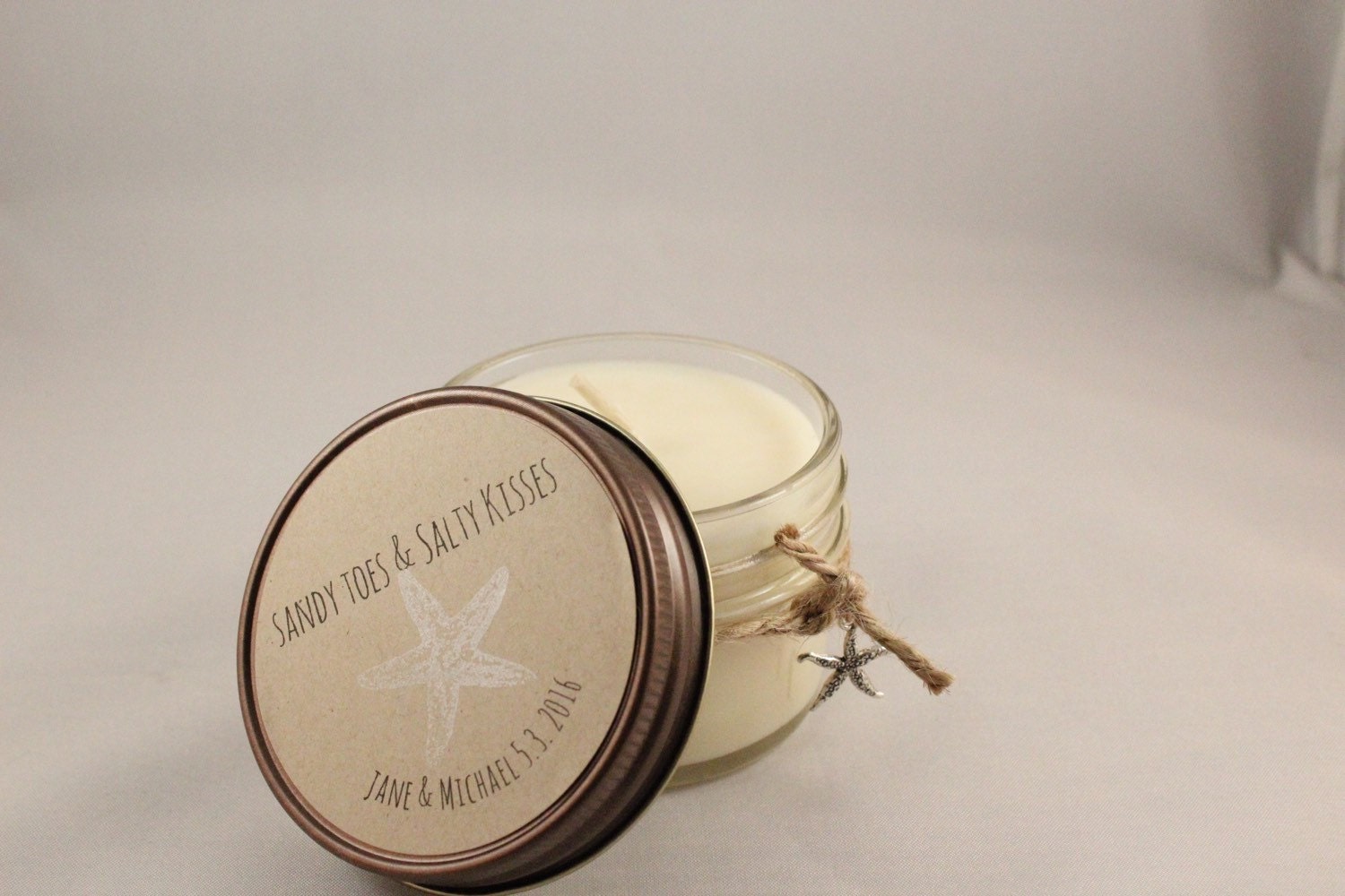These beautiful candle favors capture the essence of a day on the beach and the treasures of the ocean. Each hand poured soy candle is made in small batches with premium soy clean burning soy wax and fragrance oils in a variety of fragrances reminiscent of a day at the beach! The handsome 4oz glass jar with rustic metal top also includes a personalized label and has a metal starfish charm secured with twine. Makes a great shower or wedding favor. Also makes a great small gift that a gift card could be added to.