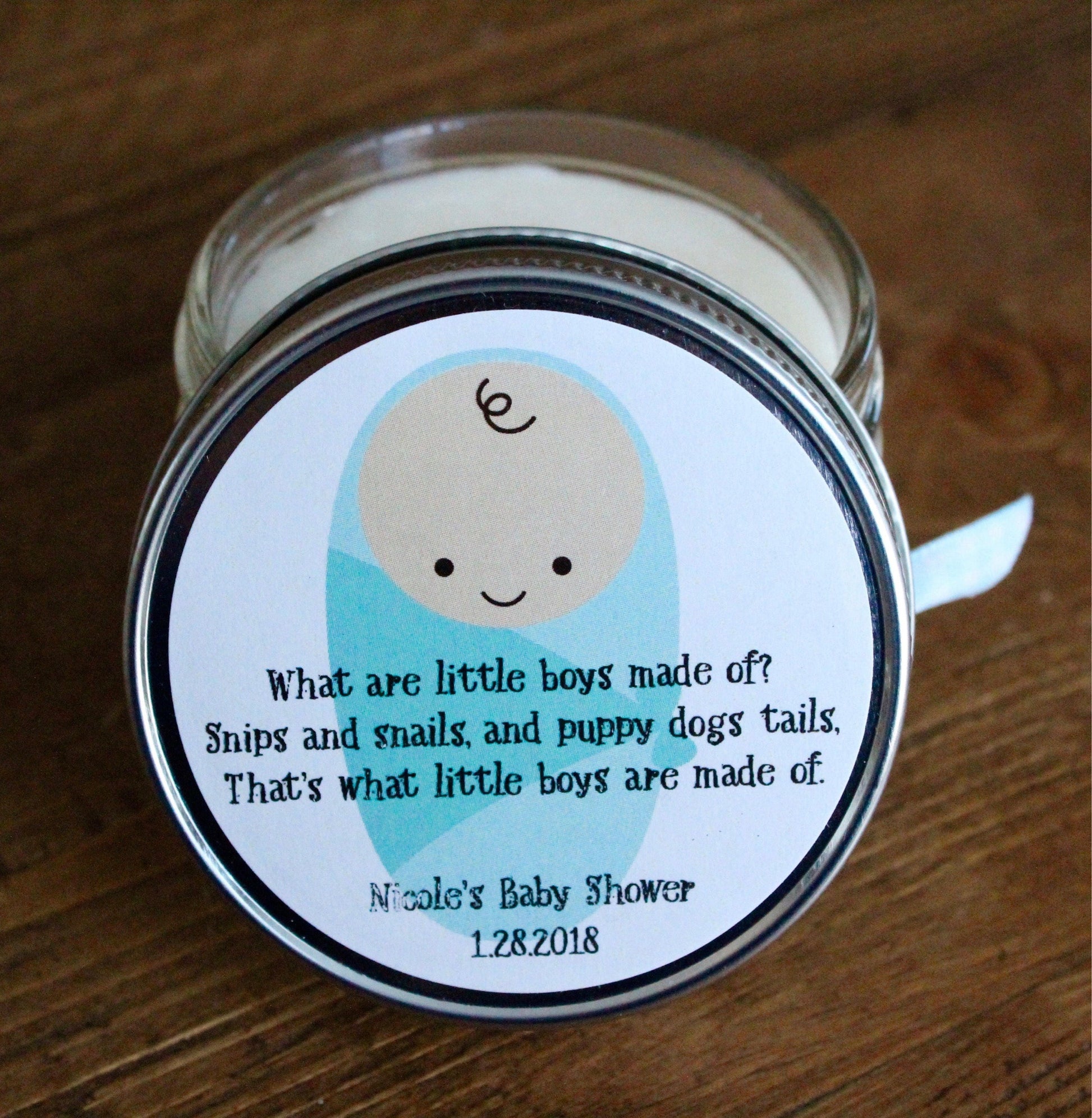 These adorable candle favors make a great memento of your baby shower. Each hand poured soy candle is made in small batches with premium soy clean burning soy wax and fragrance oils in a variety of scents that remind you of your sweet little one! The handsome 4oz glass jar with rustic metal top also includes a personalized label and is tied with baby blue gingham ribbon. Makes a great shower or wedding favor. Also makes a great small gift that a gift card could be added to.