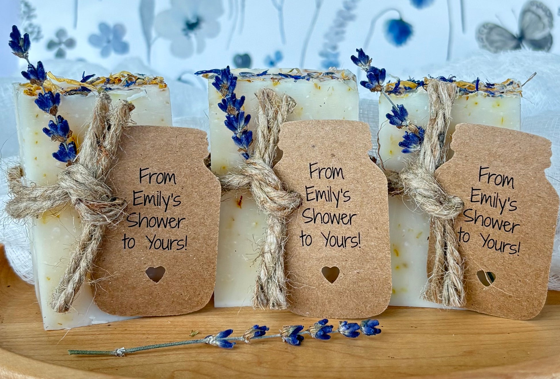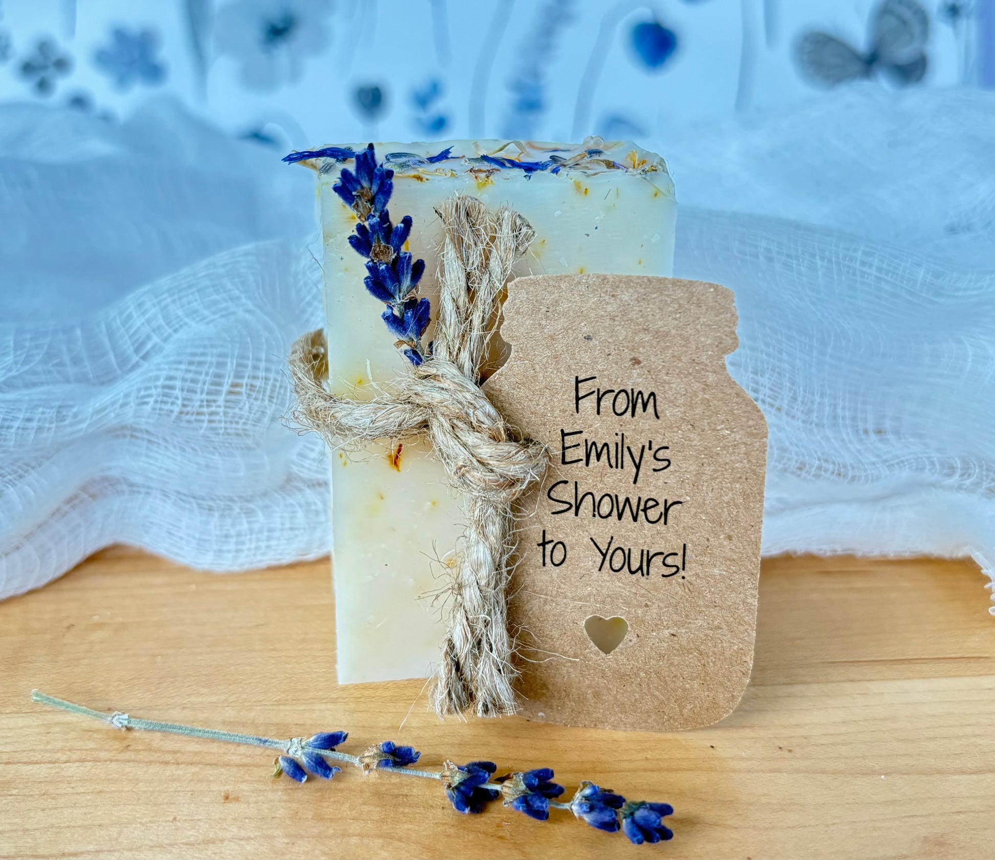 Each soap is made using the cold processed method, the natural vegetable oils are infused with calendula flowers for skin soothing properties, scented with lavender essential oil that smells just lavender sprigs in bloom. Natural botanicals sprinkled on top like lavender, blue coneflower petals and calendula complete the beauty of this beautiful soap. Made with all vegetable based oils like olive, rice bran and castor oil. Your guests will be delighted with this lovely memento