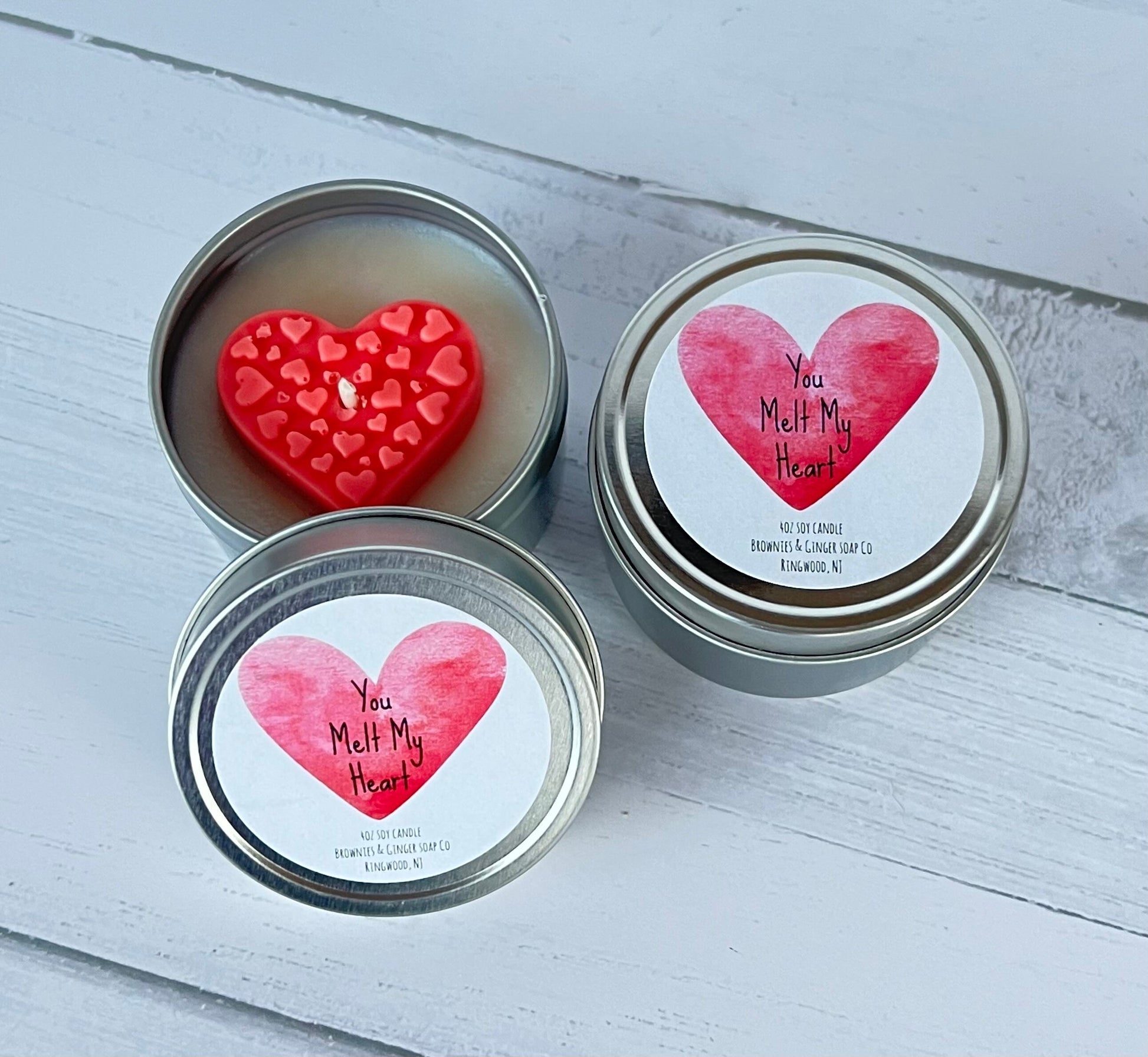 Tell the one you love how much they melt your heart! Our 4oz “You melt my heart” candle comes in a 4oz travel tin with a wax heart on top! Your heart will melt as you burn it! Scented in the scent, of your choice, your recipient will love this sentimental Valentine’s gift!