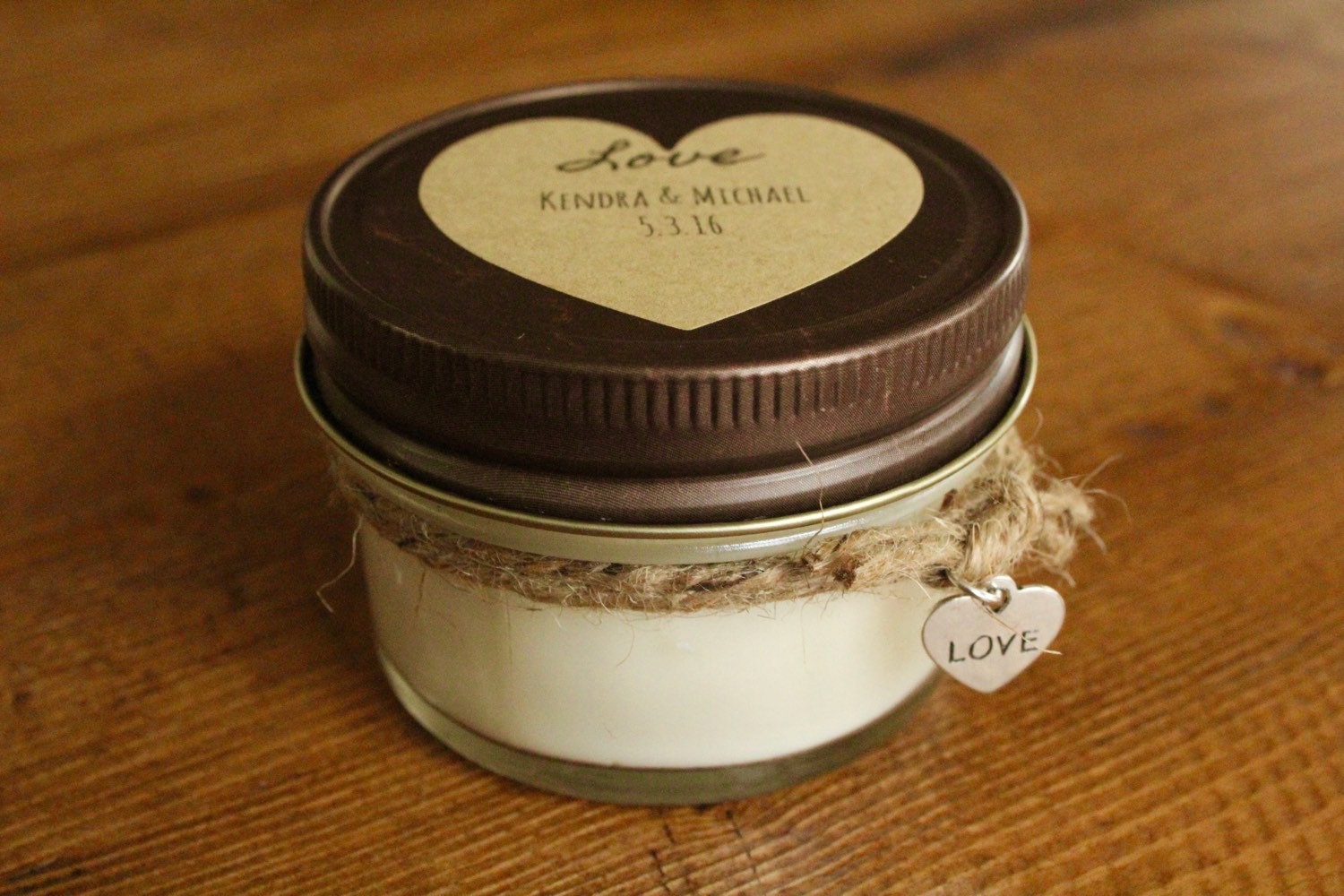 These beautiful candle favors will be a lasting memento of your special day. Each hand poured soy candle is made in small batches with premium soy clean burning soy wax and fragrance oils in a variety of fragrances reminiscent of your Wedding Day! The handsome 4oz glass jar with rustic metal top also includes a personalized label and has a heart shaped "love" charm secured with twine. Makes a great shower or wedding favor. Also makes a great small gift that a gift card could be added to.